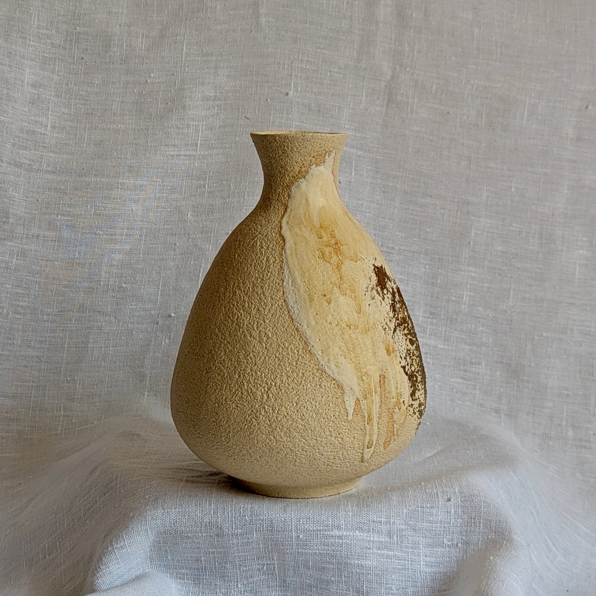 Pieza realizada en gres blanco con chamota media, lo cual le da su apariencia granulada. Cuerpo modelado a torno y textura trabajada a mano.