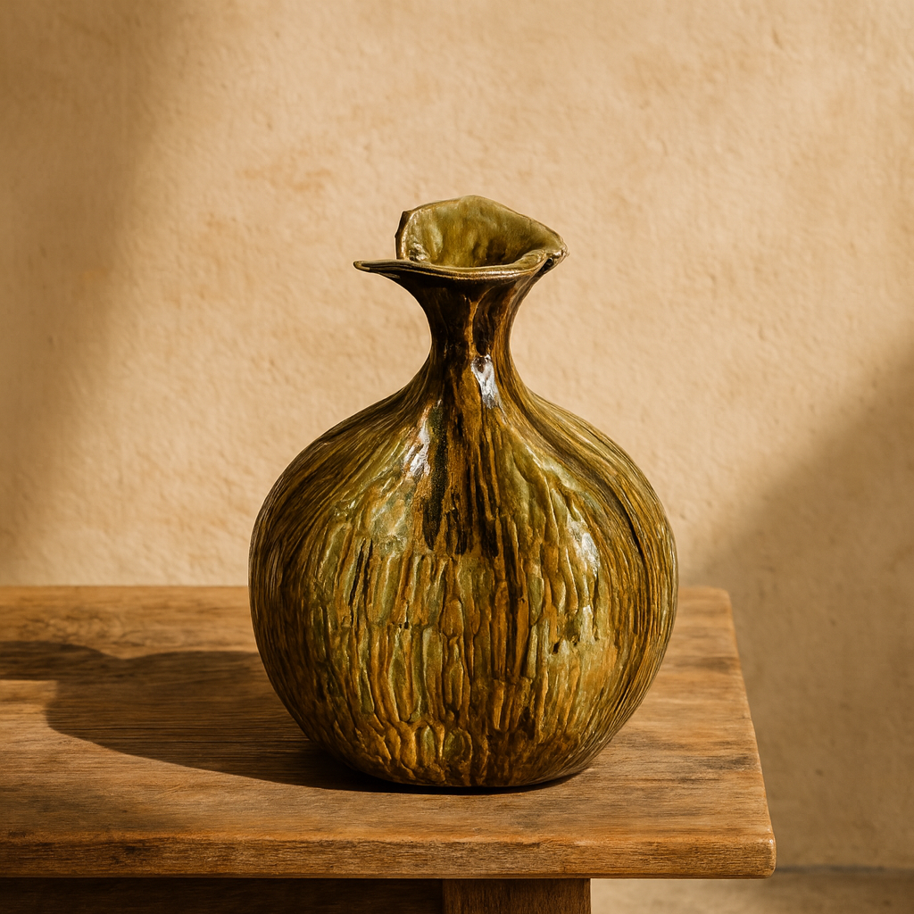 - Uso: pieza escultórica o decorativa; puede emplearse como florero (no apta para uso alimenticio)