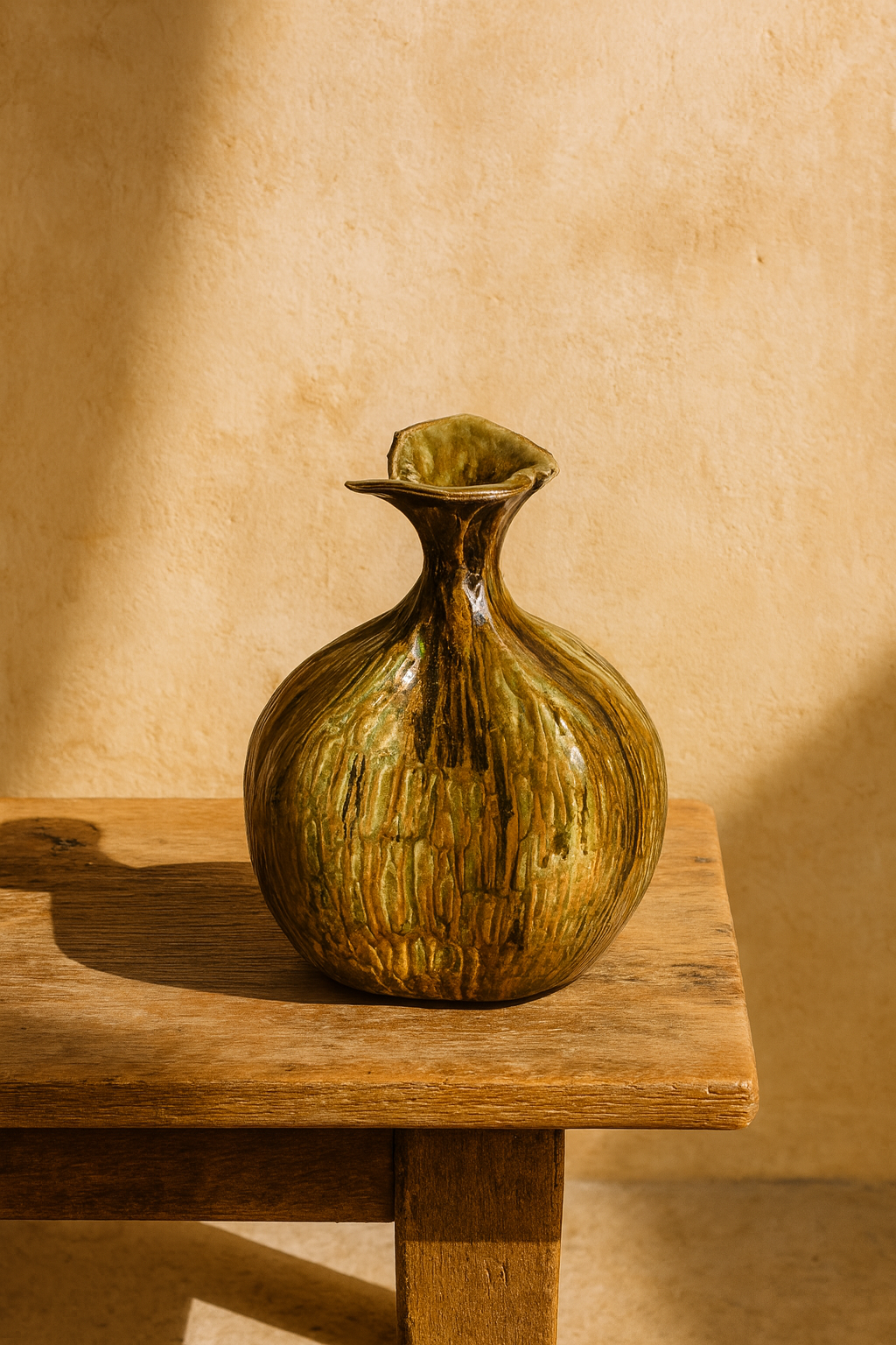 Su silueta depurada y las texturas esgrafiadas evocan la estética japonesa del wabi-sabi, donde la imperfección se transforma en belleza y la sencillez revela profundidad. El esmalte fluye en suaves caídas que recuerdan el movimiento del agua, aportando serenidad y equilibrio visual.